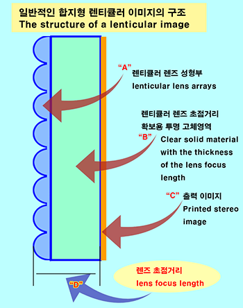 - 일반적인 렌티큘러 이미지는, 좌측의 설명도 상단의 이미지처럼 "렌티큘러렌즈 성형부(A)"와 "렌즈 초점