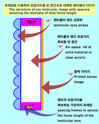 - 당사는 이러한 문제점을 극복하기 위해서 "후레임(H, H-1)"을 이미지의 가장자리에 거치하여 초점 거리를 확보하는 "투명 고체 영역(F)"을 대신해서 "빈 공간(F)"으로 대체하고 필름형의 "렌즈 성형부(E)" 즉,"박막 필름 렌즈"와 "출력 이미지(G)"를 팽팽히 당겨서 후레임에 각기 고정하는 구조로 렌티큘러 이미지를 제작하여 원가 절감은 물론 운반 및 설치가 용이하도록 제품의 무게를 혁신적으로 줄일 수 있습니다.