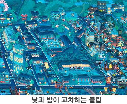 좌측의 예는 플립 효과의 적용을 낮과 밤으로 구분하여 동일한 대상의 변화를 느끼게 하는 디자인인데 상대적으로 잔상이 생길 위험이 가장 적은 방법이기도 합니다.